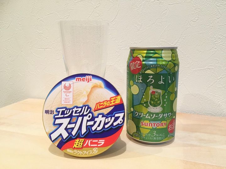 まずはスーパーカップのアレンジです。用意するのは、スーパーカップとサントリースピリッツから出ている「ほろよい<クリームソーダサワー>」。こちらのほろよい、2020年4月21日から期間限定販売されている新商品です。
