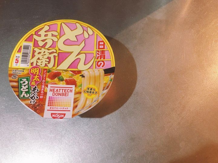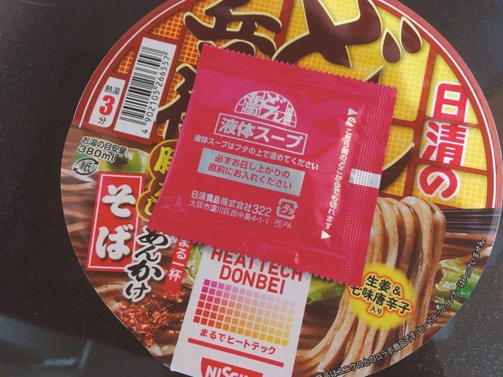 皆さんお馴染みの「どん兵衛」。そのパッケージにこれまたお馴染みの「ヒートテック」のロゴが書かれてあります。