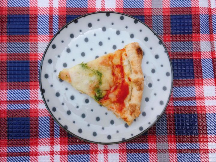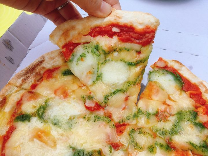 箱だけでなく、実際のピザも十分な大きさ。トマト、チーズ、バジルというシンプルな具ながらも、結構なボリュームで生地の上にのっています。個人的にはバジルソースがたっぷりで口に入れるたびに香りがしっかりして嬉しかったです。