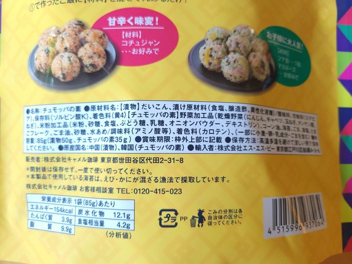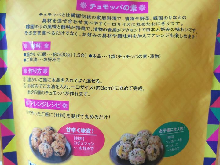 パッケージ裏に記載がありますが、チュモッパは韓国伝統の家庭料理で、漬物や野菜、韓国のりなどの具材を混ぜ合わせ食べやすく一口サイズに丸めたおにぎりです。