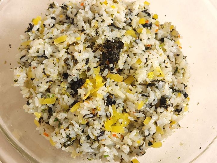 するとこんな感じに。とても色鮮やかな韓国海苔の香りが漂う混ぜご飯ができます。