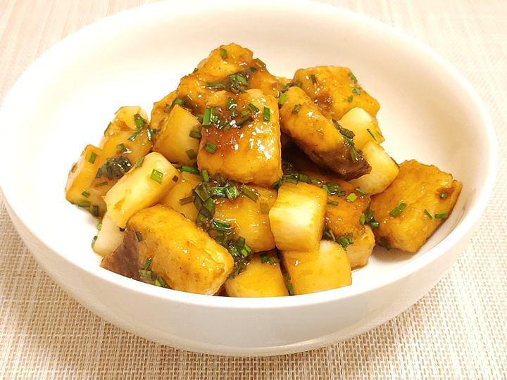 メカジキはパサつきが少なく身がふっくらしています。片栗粉をまぶすことでツルっと&フワっとした食感になり、長芋はメカジキに火を通してから炒めることで外はホクッと、中はシャキッとした食感も残る程度の仕上がりになります。メカジキと長芋の食感の違いも楽しめて食べごたえのある一品になります。