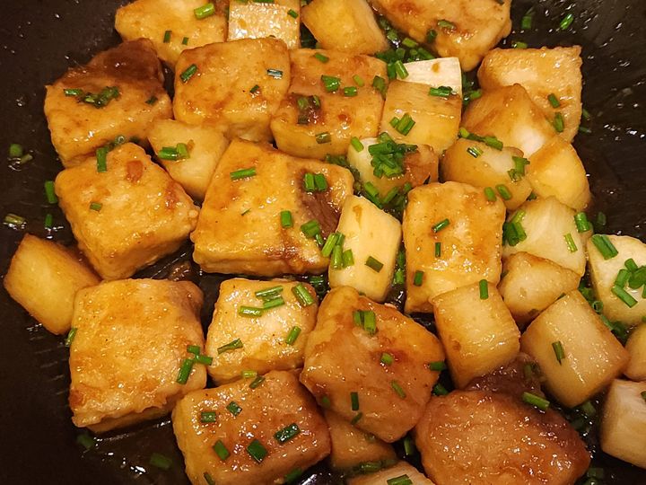 5.2の長芋を入れさっと炒めたら、3を入れて中火で炒めながらメカジキと長芋にタレをしっかり絡める。
