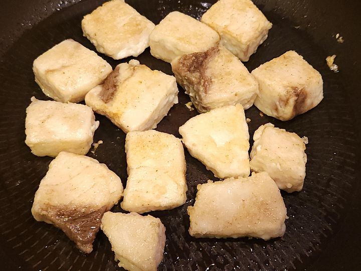 4.フライパンに植物油を入れて中火で熱し、1のメカジキを入れて表面全体が薄いきつね色になる程度に焼く。