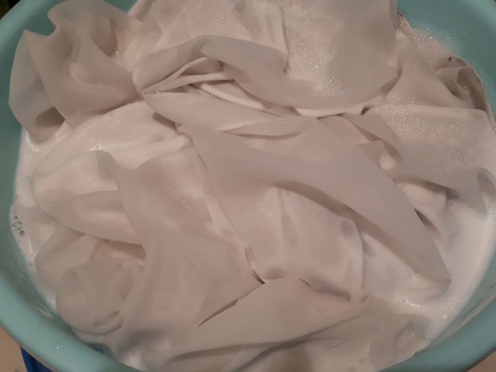 まずは試しに、レースカーテンを1枚オキシ漬け。オキシクリーンのHPにありますが、オキシクリーンは40~60℃のお湯で使うと効果的(やけどに注意!)なので、50℃のお湯にオキシクリーンを溶かしてオキシ漬けしました。写真のバケツは容量8.3Lのバケツで、手袋をしてから、お湯7L程度にオキシクリーンを備え付けスプーンの1/2杯入れて溶かし、レースカーテン1枚を入れました。その後保温のためバケツにフタをして30分ほどつけおき。