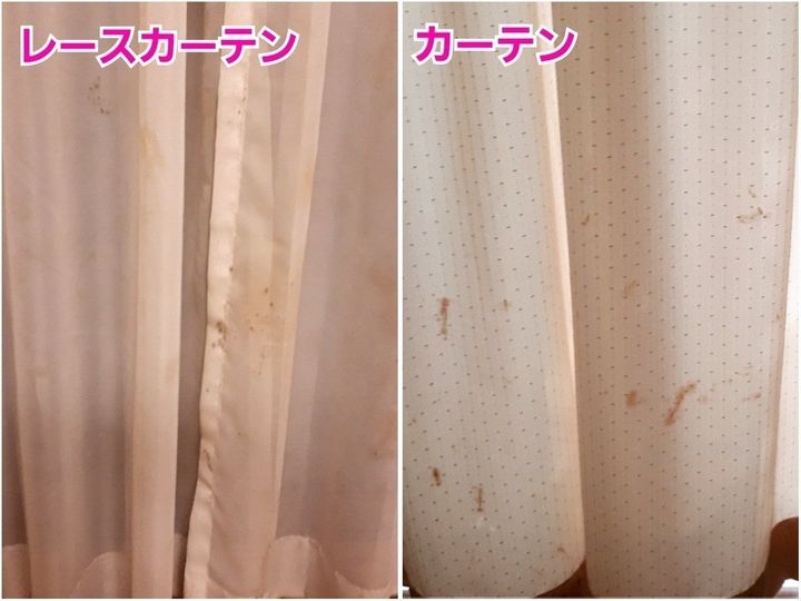 トップ写真の黒カビやシミだらけの汚いカーテン、とっても恥ずかしいのですが、私が5年間見て見ぬふりをし放置していた我が家のカーテンです。少しずつ汚れていくのを気付いていながら、子供たちの成長とともに洗濯物が増え、「週末は野球着の洗濯で手一杯だし」「カーテン外すと家が丸見えになっちゃうし」「そのうち買い換えればいっか」など心の中で都合よい言い訳をしながら、毎回気になりつつも放置。結果こんなことに(汗)。
