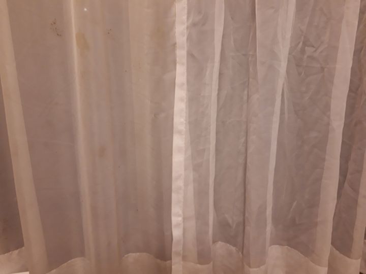 カーテンを入れた瞬間から溶液が黒くなりはじめていましたが、30分後にはほとんどの汚れが取れていました。手袋をつけた状態で少しだけ残っていた黒カビ部分を靴ブラシで軽くこすると黒カビも落ちました。その後カーテンを軽く絞って洗濯機へ。ソフト洗いのモードで洗濯し終了後は元のカーテンレールにかけて乾燥させました。