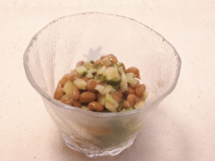 刻んだ古漬けと納豆を混ぜると、発酵食品どうしで相性も良くとっても美味しくなります。写真はキュウリとセロリの古漬けを刻んだものと納豆を混ぜたものです。古漬けの塩分があるので、醤油や納豆のタレは少なめにした方がよいです。