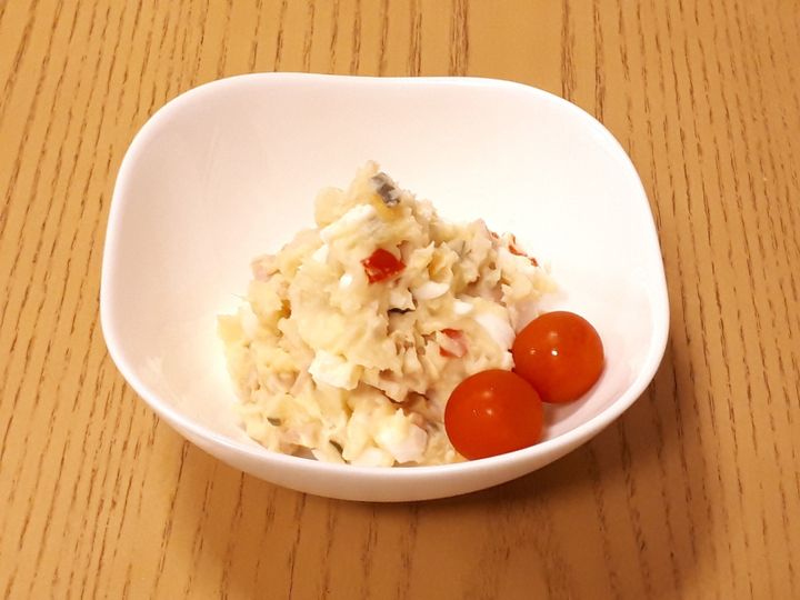 こちらは、茹でてつぶしたジャガイモに古漬けタルタルと刻んだハムを混ぜてポテトサラダに。こちらも刻んだ古漬けが入ることで食感も良く、我が家では子供たちにも好評の一品です。