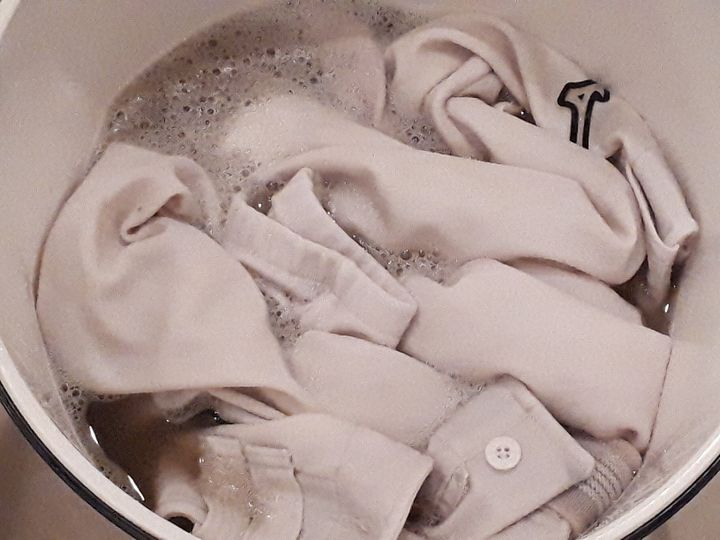 バケツウォッシャーのバケツに40℃~50℃のお湯を入れて泥汚れに強い洗剤または石鹸を溶かし、汚れたユニフォームやソックスを入れます。こちらの写真は、ユニフォーム(ズボン)2枚と白ソックス2足が入っています。