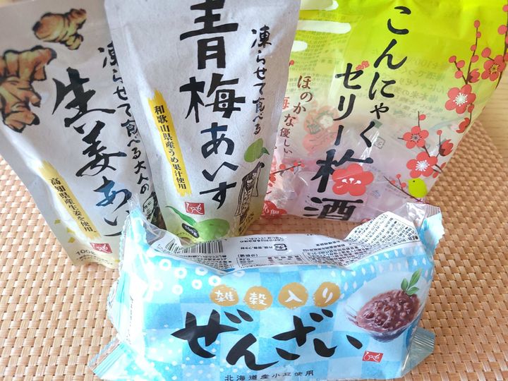 冷蔵庫で冷やして食べるとおいしい雑穀入りぜんざいとこんにゃくゼリー梅酒、冷凍庫で凍らせる青梅あいすと生姜あいす。いずれも大人向けのちょうどよい甘さや風味となっており、暑くなり始めた初夏にピッタリのおすすめスイーツです。