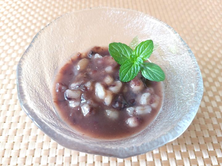 もち麦、丸麦、黒米、発芽玄米、焙煎挽割大豆といった雑穀が入ったぜんざいで、冷やしぜんざいはもちろん、温めて食べることもできます。