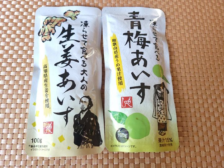 最後にご紹介するのは、凍らせて食べるアイスバーです。「青梅あいす」と「生姜あいす」の2種類があり、いずれも1袋100g入りで税込み128円で販売中です。