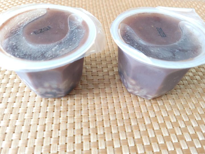パッケージを開けると、写真のようにカップ入りのぜんざいが2個入っています。パッケージ裏にも記載がありますが、雑穀などの固形分が沈殿しているので、カップのまま食べる場合は、よくかき混ぜてから食べることをおすすめします。