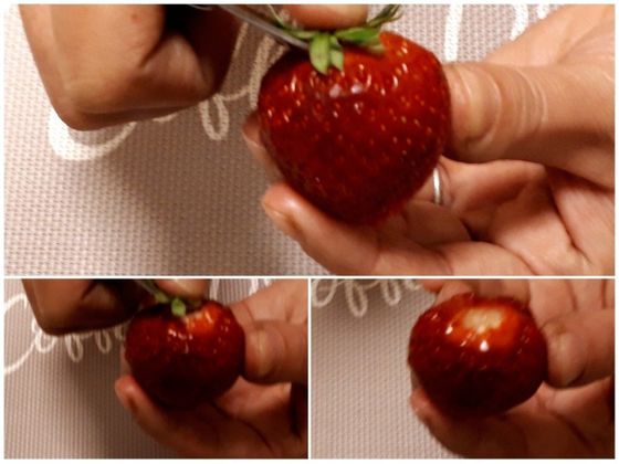 1.「イチゴのへた取り」の先端爪の部分をへたの根本に斜め45°くらいの角度で差し込む。