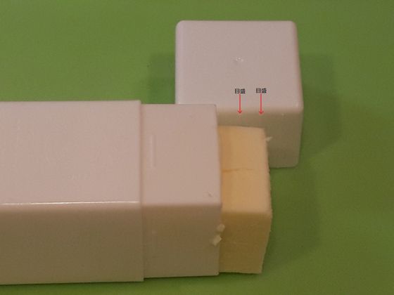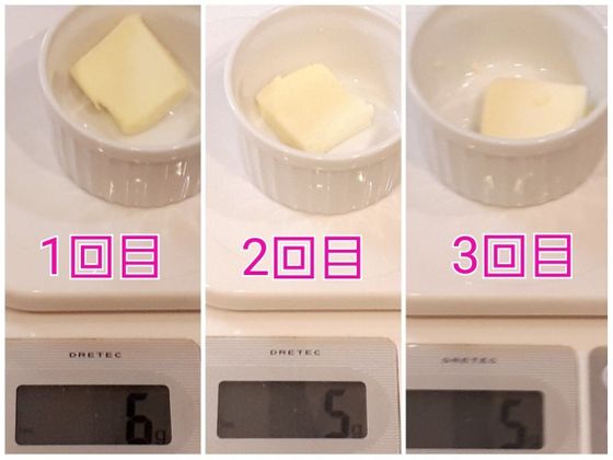 バタースティックのキャップには目盛がついていて、1目盛5gでカットできるというので、実際に試してみました。一回目は6gになってしまいましたが、目盛りをよく見てカットしたら、2回目と3回目は5gになってました!