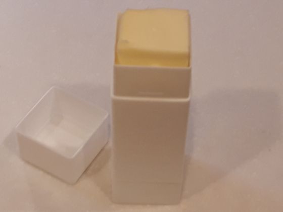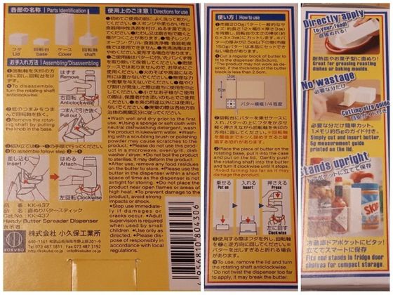 パッケージ表面だけを見ると、パッケージのような形をした市販のバターをそのまま入れて使うケースなのかと思う方もいるのではないかと思いますが、パッケージの裏と側面の説明を見ると、箱の中に入っているケースは、6cm×3cm×3cmの直方体にカットしたバターを入れる、リップスティックのような回転軸が付いたケースであることが分かります。
