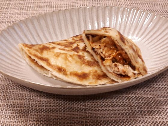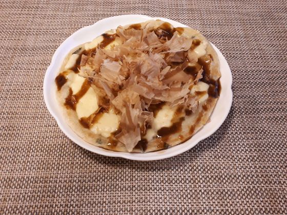 焼きあがった葱抓餅は、そのまま食べても、醤油やお好みのタレを付けて食べても十分美味しいです。子供が待ちきれない時などはそのままで出しますが、ひと手間かけられる時は、お好み焼きみたいにしたり、中にいろいろなものを挟んだりして食べます。