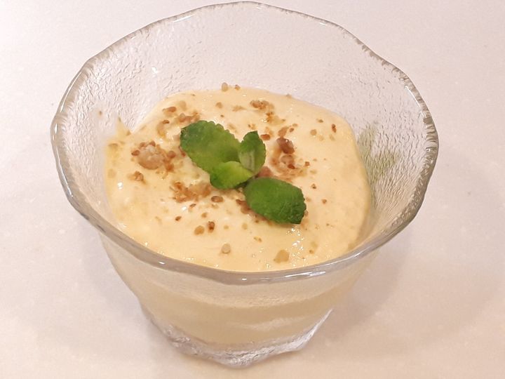 こちらは、クリームチーズと生クリームを加えて粉寒天でゆるめに固めて作ったマンゴーレアチーズです。マンゴーが甘いので砂糖は使いません。解凍したマンゴー200gと常温に戻したクリームチーズ100gをミキサーにかけピュレ状にしてボウルに移します。小鍋に生クリーム50mlと粉寒天2gを入れて弱火にかけてよくかき混ぜ、粉寒天を完全に溶かして粗熱をとったら、ボウルに入れておいたピュレ状のマンゴークリームチーズに入れてダマができないようによくかき混ぜ、好みの容器に入れて冷蔵庫で冷やして完成です。