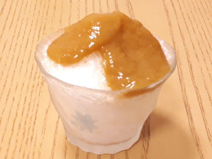 そしてこちらは、マンゴーをミキサーでピュレ状にして鍋に入れ、砂糖(お好みで調整)とレモン汁少々を加えて煮詰めて作ったマンゴーソースをかき氷にかけたものです。ちょっと贅沢なかき氷になります。私は、かき氷にかけるために作る時は砂糖を入れますが、ヨーグルト用のソースにする時は砂糖は入れません。