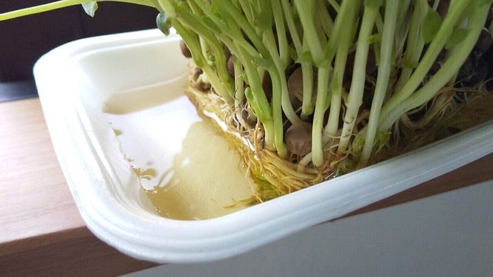 調べてみてもあまりこのような栽培方法について言及している内容を見つけることができなかったのですが、筆者しては、豆苗の重さによる根への負担が減ったり、より多く水に触れる面積を増やせたのが要因ではないかと考えました。