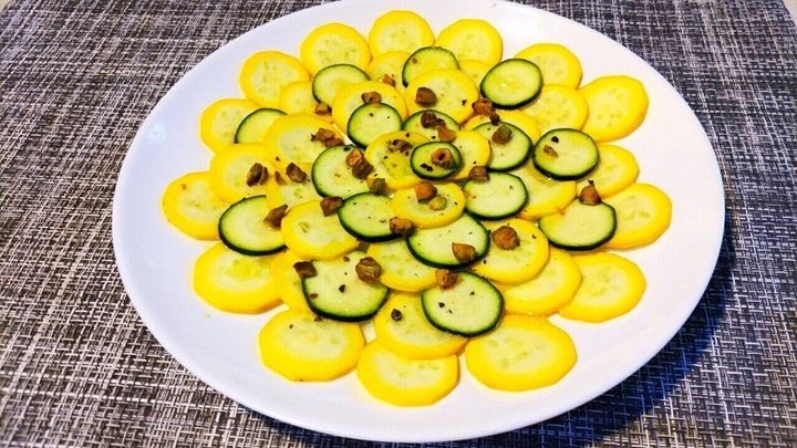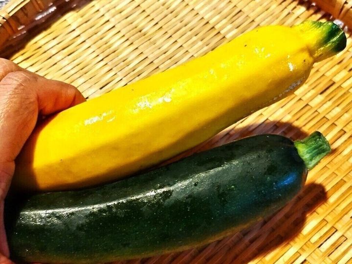 ズッキーニには、皮が緑色のものと黄色のものがあるので、どちらも手に入るのであればより華やかな仕上がりになりますよ。