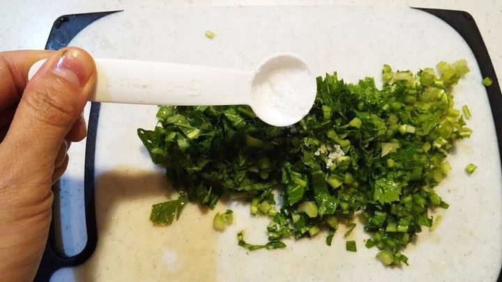 2. 刻んだかぶ(葉)に塩を振ってもみ、しんなりしたら水気を絞る。