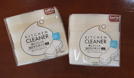 セリアの白いスポンジは3つで100円。長持ちするスポンジよりも、へたったら新しいものにかえる方が衛生的にもいい気がします。