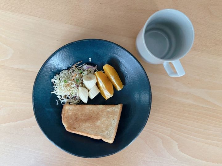 平日の朝食はパン食で定番化。女性陣の毎日の朝食はパン、フルーツ、ヨーグルト、ミッスク野菜。男性陣はそこに目玉焼きとウィンナーを追加。