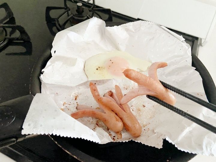 朝食時にフライパンを使う際にはセリアの「くっつきにくいホイル」を活用しています。シリコン樹脂コーティングがされているので油を引く必要もなく、フライパンを使い終わったらアルミホイルを小さく丸めて捨てるだけ。フライパンを洗う手間を省くことができます。