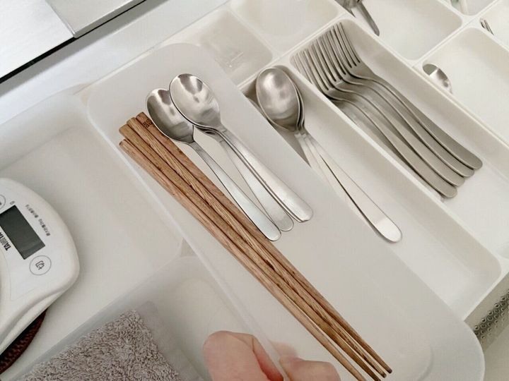 カトラリーの中でもお箸だけは、食器棚の引き出しの中の収納ケースにセリアの「キッチン整理M」を重ねて収納しています。こうしておけば、毎回お箸のボックスをベースにして、食卓の内容に応じてスプーンやフォークを足してボックスごと運べます。