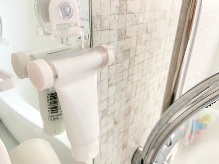 引っ掛けるだけなので、取り外しも元に戻すのも簡単で、歯磨き粉の定位置を作ってあげるのにとっても便利です。
