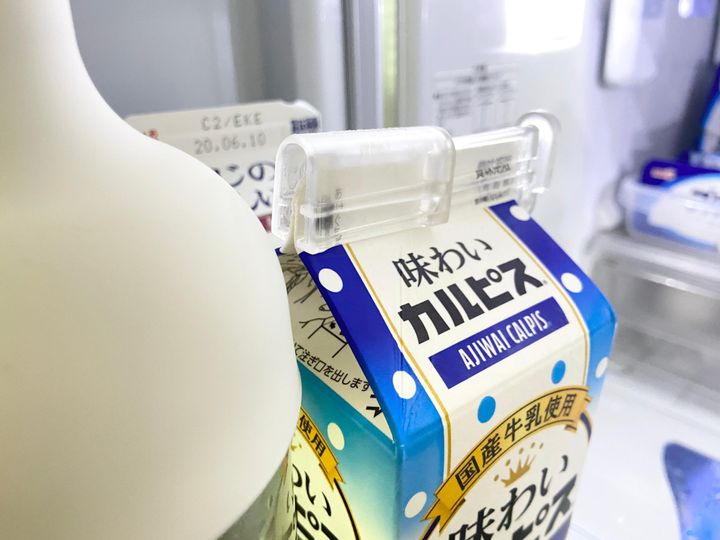 冷蔵庫の匂いも移りにくく、キャップも取り付けたまま注げるのでとっても楽ちん。クリアなので賞味期限もしっかり見えます。
