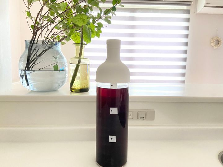 冷蔵庫の場所を取らないコツは保冷ポットを使うことです。タネを入れるボトルには1/3ずつでマステで目盛りを付けておき、保冷ポットに1/3のタネに水と氷を加えればお茶の完成です。