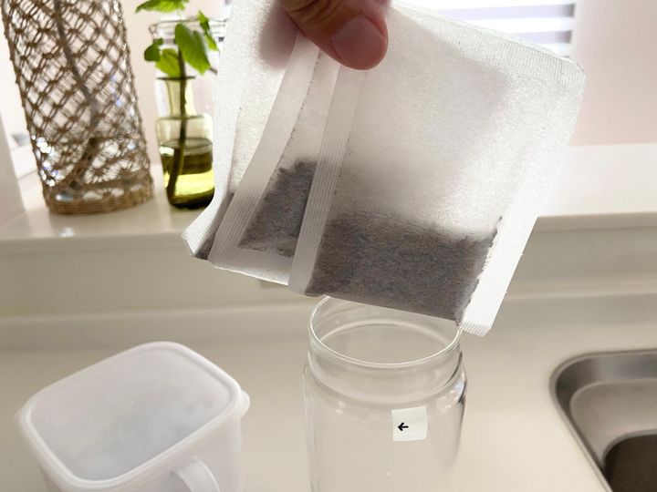 お茶を省スペースで大量に作るコツはズバリお茶のタネを作っておくことです。1Lのお茶用に1パックであれば1Lで3パック入れてタネを作ります。これで1L用ボトル3個分のお茶を作ったことになります。作る際は煮出しでも水出しでも良いのですが、時短のコツは少量のお湯を入れて1分蒸らした後水を入れて即冷蔵庫で冷やす方法。これだと水出しよりも抽出時間が短く、風味がよく、水で温度が下がっているので常温で冷ます必要もなく冷蔵庫にすぐに入れられるのでお茶の持ちが良くなります。