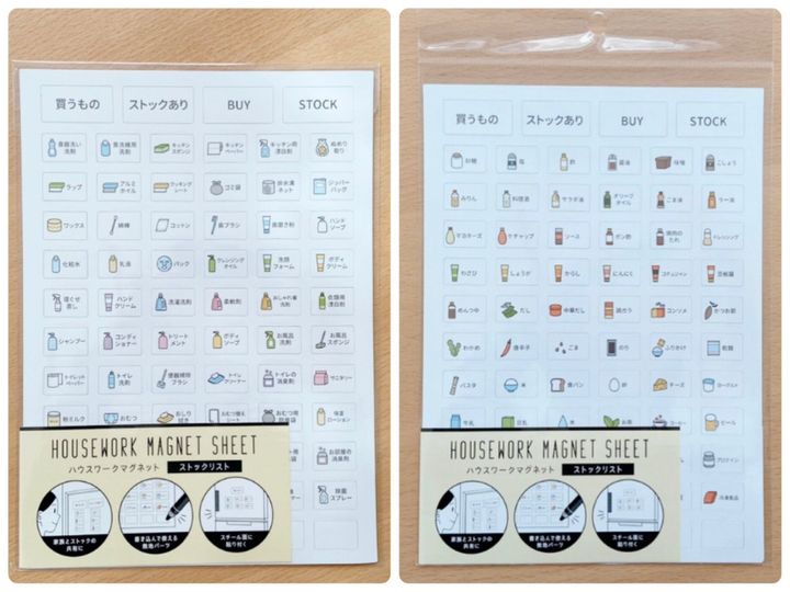 そんな中キャンドゥで発売された冷蔵庫やホワイトボードに貼り付けて使用できる「ハウスワークマグネット・ストックリスト」にずっと注目していたんです!人気過ぎて品薄で1年間発見できずでしたが、この秋にや〜っと食品版を発見しました。日用品版は同じくサンキュ!STYLEライターのKaoruさんが見つけて送って下さって手元に。
