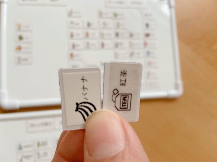 一から自作するのは大変ですが、無地パーツに手書きしたり、テプラで貼り付けるだけなら簡単。よく買うもので、コレがないなというものは無地パーツにテプラを貼ってマグネットを追加して我が家用にカスタマイズしていってます。