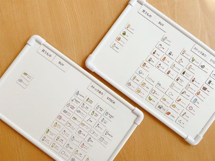 シンプルなイラストと文字で食品や日用品が描かれているのでパッと見てわかりやすいのが特徴のマグネットです。「買うもの」と「ストックあり」でマグネットを移動させるだけで買い物リストが出来上がります。