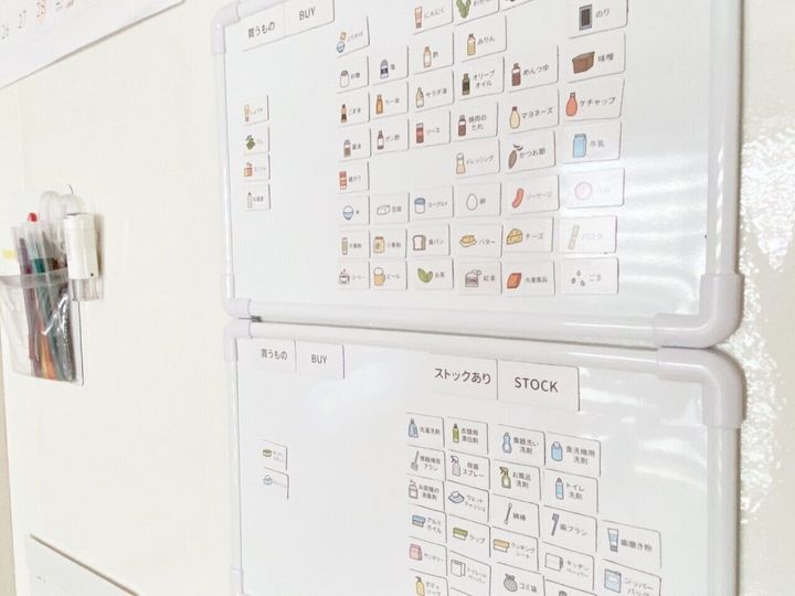 我が家ではダイソーのマグネット付きホワイトボードを使って、(右)ストックあり品、(左)買うもので分けて管理しています。