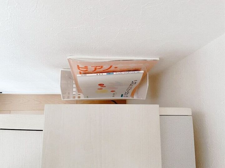 ピアノ横の壁面に楽譜収納をするのに最近新規購入したのが「Desk Labo」のメールBOX Lサイズ。浮かして収納できるように穴が2つ付いているので壁面フックに吊るして収納しています。