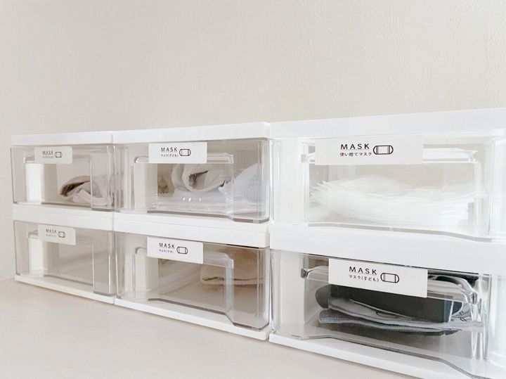 元々は洗面所の小物収納に使っていたのが「Desk Labo」のプルケース。Withコロナで玄関のマスク収納ケースに転用し、家族全員分のマスクを収納するのに使っています。玄関にマスクを収納するようになってから忘れて取りに戻ったりという手間が減りました。