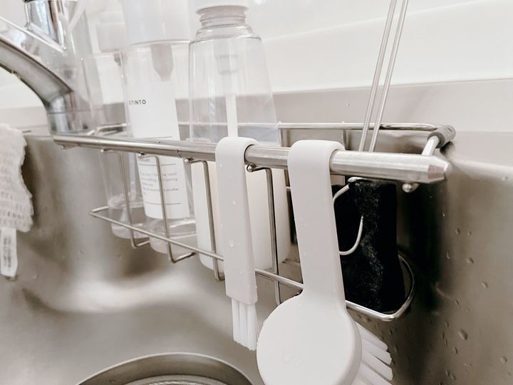 「水切りカゴにかけられる」シリーズが便利なのは、柄の先がフックになっていてシンクのポケットや水切りカゴに引っ掛けられるようになっている点!収納場所に悩む必要がありません。取るのも戻すのもとってもスムーズなので、使い勝手がとっても良いです。