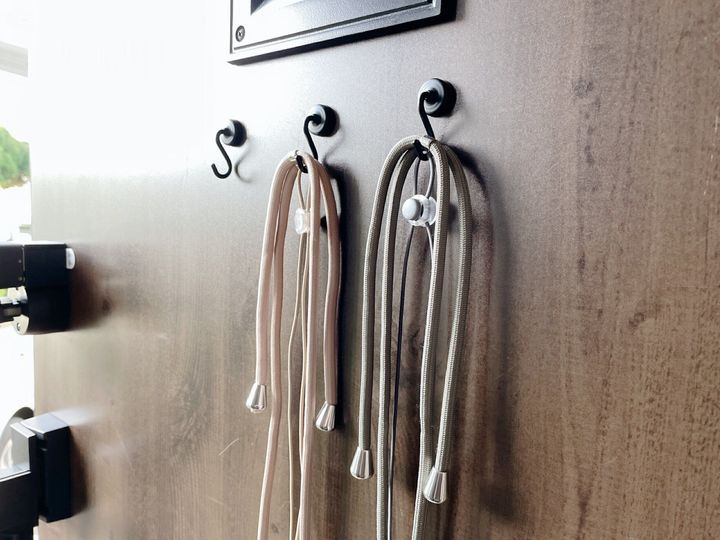 子ども達はついつい面倒で着用したままになりがちなので、週末用に玄関にセットしているのがマスク用ストラップ(セリア、税込110円)。ゴムタイプのストラップでアジャスターで長さの調節ができ、着用は簡単でマスクの紐に通して首から掛けるだけ。マスクの着け外しが簡単になったので、スムーズにマスクを外してくれるようになり重宝しているアイテムです。