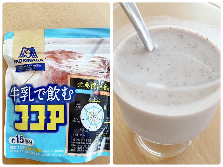 今回は栄養機能食品で、冷たい牛乳にサッと溶け、1杯でカルシウム・鉄・ビタミンDが1日の1/2量摂れる牛乳で飲むココアを選択。バラバラで取り入れるのが面倒になったら、フルグラに飲むココアを混ぜて牛乳を入れれば1回で2つを取り入れられるので便利だと思ったのも取り入れる決め手になりました。