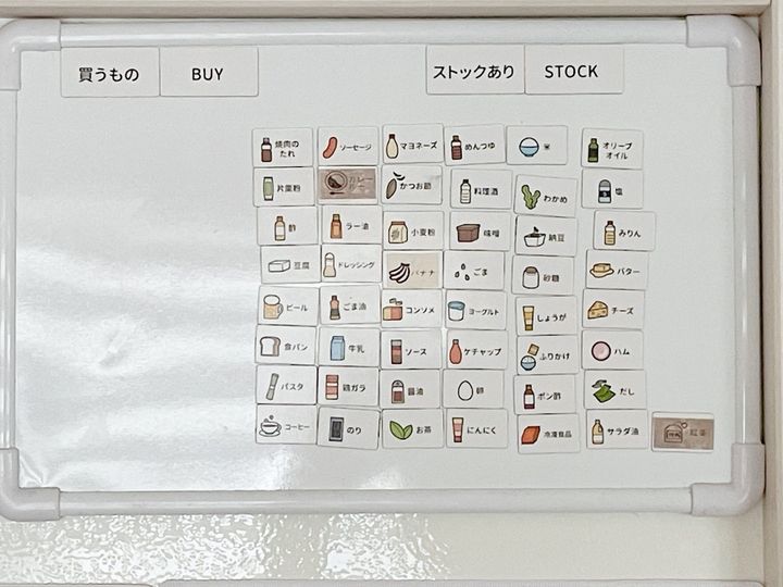 第2の活用法は買い物リストの作成と管理。ダイソーのマグネット付きホワイトボードとキャンドゥのストック管理マグネットシート(食品版と日用品版の2つ)を使って買い物リストを作成します。家族全員がないもの・なくなりそうなものがあれば、買うもの側にマグネットを移動させるだけの簡単管理。掃除の手間も書く手間もないのでず~っと活用しています。