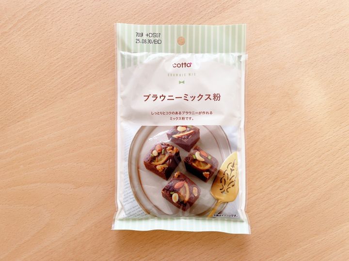 バレンタインというとメジャーなのがブラウニーですよね。ダイソーで購入できるcottaのブラウニーミックス粉は10x10cmの型で作るのがちょうど良いサイズの70g。作り方はとっても簡単で裏面にレシピ付き。バターをレンジで溶かして卵と牛乳と混ぜたところにミックス粉をINするだけ。ヘラで混ぜて後は型に流し込んで焼くだけです。