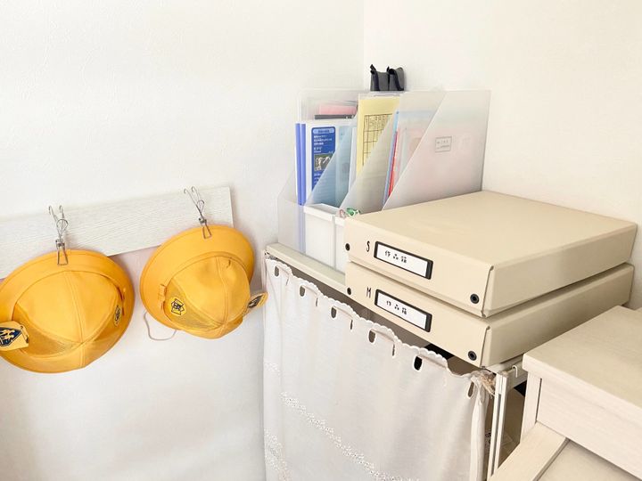学校の帽子は、無印良品の壁につけられる家具とステンレスひっかけるワイヤークリップを使って収納しています。これは学校での帽子の収納からヒントを得たもの!黄色い帽子がその辺に置かれていると目立ってしょうがないので、リビング入り口からは死角になる位置に設置しています。帽子の収納は意外と忘れやすいので考えておくことをおススメです。