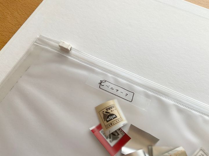 学校に提出するようなベルマークなどはファイルにポケットを貼って集めておくと便利です。家にあったファスナーケースを両面テープで貼ってポケットにしています。最近は100円ショップで貼り付け用のポケットが色々販売されているので、収集したいもや、ファイルとは別管理したいものがあれば、用途に合わせてぴったりものを探してくるのも良いと思います。