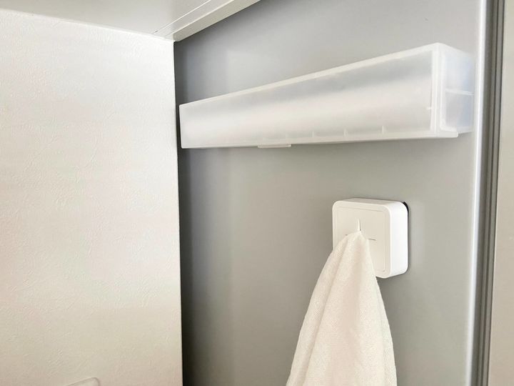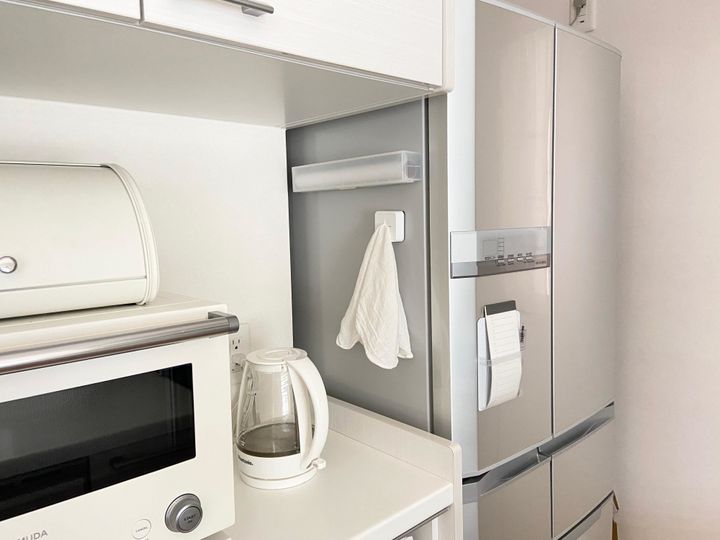 我が家が冷蔵庫の側面に収納しているのはサランラップと食器用の布巾です。ラップは無印良品のポリプロピレンラップケース(大)と専用マグネットを貼り付けたものと、ニトリのシンク扉タオルホルダーです。