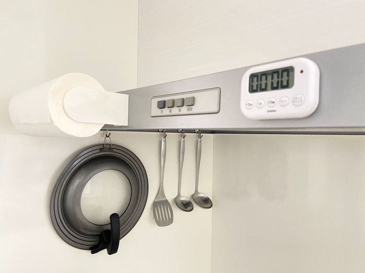 我が家ではおたま、フライパン返し、フタを強力マグネットフックで吊るしています。キッチンペーパーは無印良品のキッチンペーパーホルダーを使って浮かしており、タイマーは元々マグネット付きのものを選んでいます。